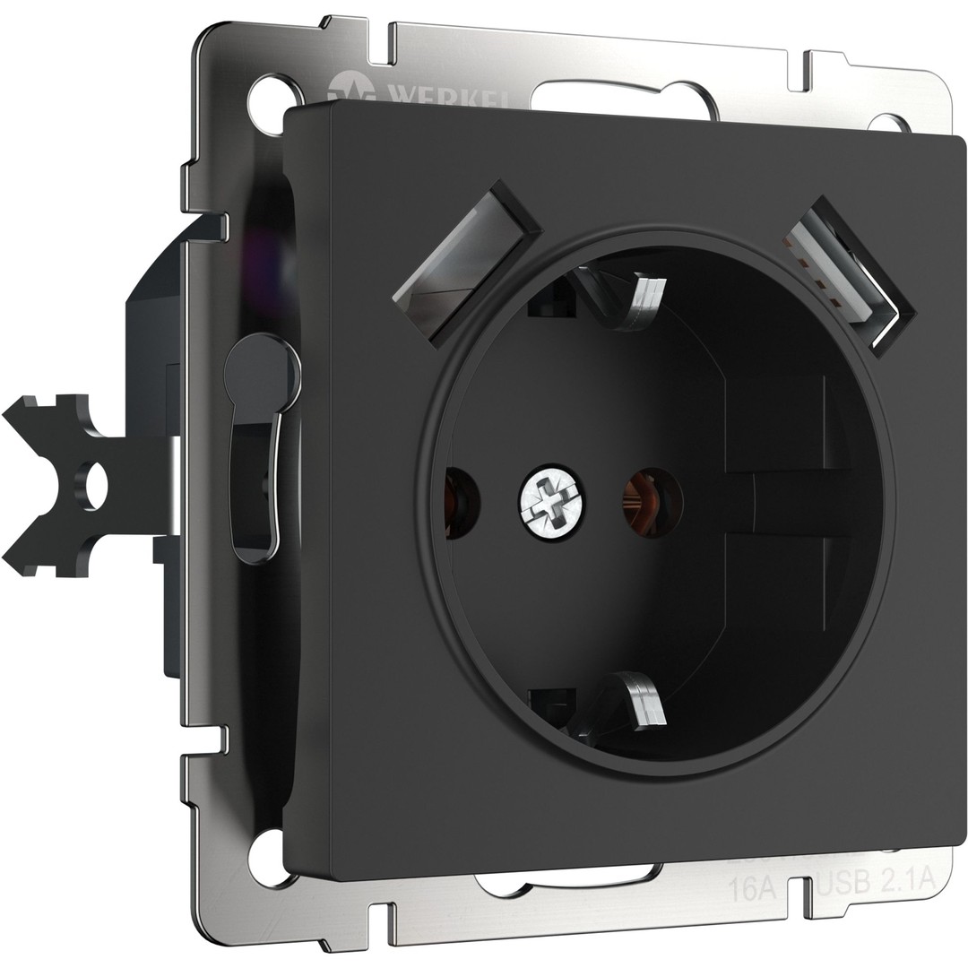 Розетка с заземлением, шторками и USBх2 (черный матовый) (W1171508)